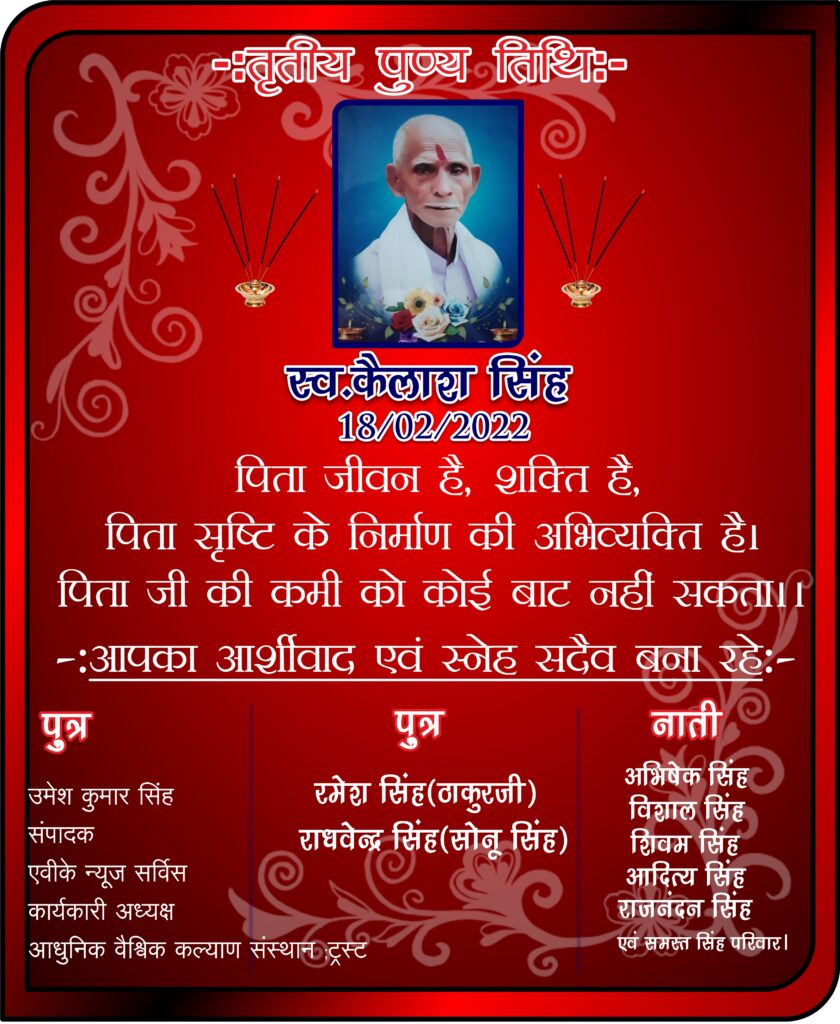 पिताजी की तृतीय पुण्यतिथि पर शत-शत नमन और भावपूर्ण श्रद्धांजलि अर्पित करता हूँ ।। पिताजी ! मैं हमेशा आपके सद्कर्मों और आदर्शों पर चलकर , आपके सामाजिक कार्य और प्रेरणादायी जीवन से सीख लेकर औऱ आपके द्वारा दिखाए गए रास्ते और संस्कारों को साथ लेकर हमेशा आगे बढ़ता रहूँगा ।