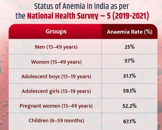 - 67.1% बच्चे और 59.1% किशोरियाँ भारत में एनीमिया से प्रभावित हैं (NFHS-5)।
