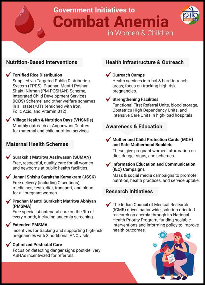 हालांकि स्वास्थ्य राज्य का विषय है, लेकिन केंद्र सरकार ने राष्ट्रीय स्वास्थ्य मिशन (NHM) के तहत सभी राज्यों और केंद्रशासित प्रदेशों को वित्तीय और तकनीकी सहायता प्रदान की है। राष्ट्रीय आयरन प्लस पहल (NIPI) और साप्ताहिक आयरन फोलिक एसिड अनुपूरण (WIFS) जैसी योजनाएं जमीनी स्तर पर प्रभावी ढंग से लागू की जा रही हैं।