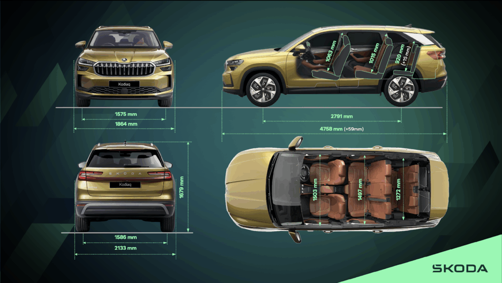 कोडिएक की नई पीढ़ी अपनी पिछली पीढ़ी की तुलना में 59 एमएम लंबी है। इसकी लंबाई 4,758 एमएम और ऊंचाई 1,679 एमएम है। यह 1,864 एमएम चौड़ी है और इसका व्हीलबेस 2,791 एमएम है। पूरी तरह लोड होने पर, नई कोडिएक जमीन से 155 एमएम ऊंची रहती है। तीन-पंक्ति वाली इस लग्ज़री 4×4 में पहले की तरह अपने वर्सेटाइल इंटीरियर में काफी सामान रखने की क्षमता है। सभी तीन सीटों को ऊपर करने पर, कोडिएक में 281 लीटर का लगेज स्पेस मिलता है। तीसरी पंक्ति की सीटों को फोल्ड करने पर, यह लग्ज़री एसयूवी 786 लीटर सामान ले जा सकती है, और पीछे की दोनों पंक्तियों को फोल्ड करने पर, कोडिएक में सामान रखने के लिए 1,976 लीटर की क्षमता मिलती है।