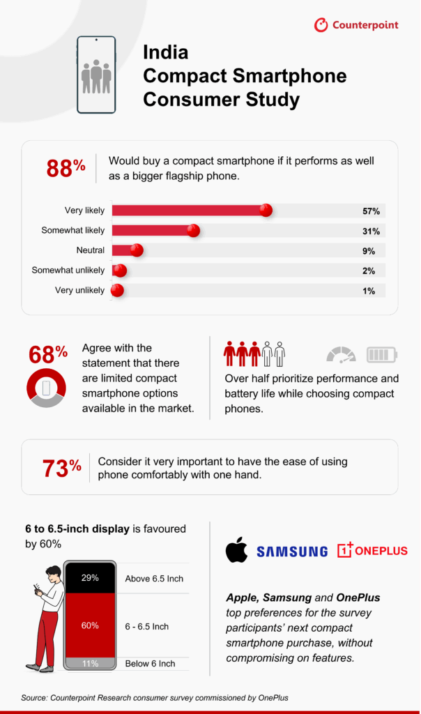 Counterpoint Research’s latest consumer survey in India highlights a strong preference for compact smartphones (74%), yet 68% of the respondents believe the market currently offers limited choices in this form factor.