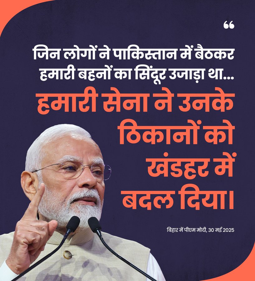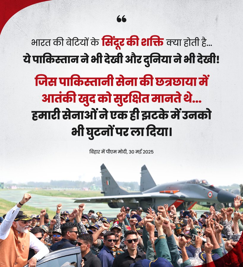 उन्होंने कहा कि आज, जब मैं एक बार फिर से बिहार में आया हूं, तो उस प्रतिज्ञा को पूरा कर चुका हूं। श्री मोदी ने कहा, “जिन लोगों ने पाकिस्तान में बैठकर हमारी बहनों का सिंदूर उजाड़ा था, हमारी सेना ने उनके ठिकानों को खंडहर में बदल दिया।” उन्होंने कहा, भारत की बेटियों के सिंदूर की शक्ति क्या होती है, यह पाकिस्तान ने भी देखी और दुनिया ने भी देखी।” उन्होंने कहा कि जो आतंकवादी कभी पाकिस्तानी सेना के संरक्षण में खुद को सुरक्षित महसूस करते थे, उन्हें भारत की सेना ने एक ही निर्णायक कार्रवाई में घुटने टेकने पर मजबूर कर दिया है। श्री मोदी ने इस बात पर जोर दिया कि पाकिस्तान के एयरबेस और सैन्य प्रतिष्ठान मिनटों में नष्ट कर दिए गए। उन्होंने कहा, “यह नया भारत है – अपार शक्ति और गतिशीलता वाला भारत”।