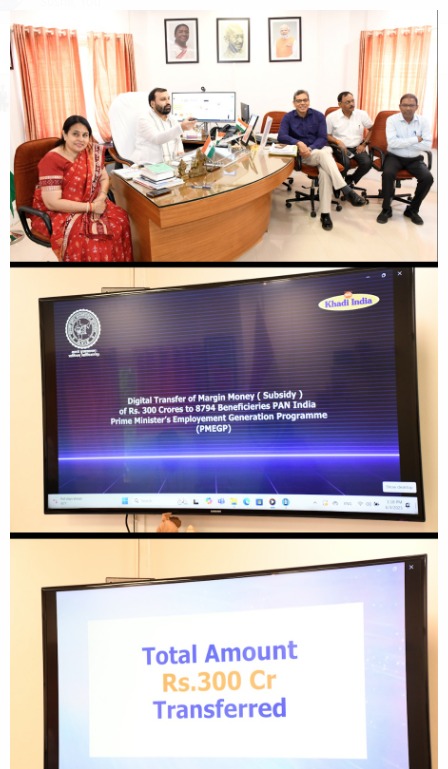 सूक्ष्म, लघु और मध्यम उद्यम मंत्रालय के खादी और ग्रामोद्योग आयोग (केवीआईसी) ने प्रधानमंत्री रोजगार सृजन कार्यक्रम (पीएमईजीपी) के तहत मंगलवार को वर्चुअल कार्यक्रम आयोजित कर देश भर के 8794 लाभार्थियों को 300 करोड़ रुपये की मार्जिन मनी सब्सिडी वितरित की। यह संवितरण लगभग 884 करोड़ रुपये के ऋण स्वीकृति के एवज में किया गया। यह कार्यक्रम केवीआईसी केंद्रीय कार्यालय, इरला रोड, विले पार्ले (पश्चिम), मुंबई में आयोजित किया गया, जिसमें केवीआईसी के अध्यक्ष श्री मनोज कुमार ने लाभार्थियों को वर्चुअल माध्यम से सब्सिडी जारी की। इस अवसर पर केवीआईसी की सीईओ सुश्री रूप राशि सहित केंद्रीय कार्यालय के अन्य वरिष्ठ अधिकारी उपस्थित थे।