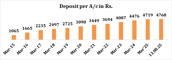 योजना के अंतर्गत खातों के बढ़ते उपयोग और बचत की आदत को दर्शाते हुए 13 अगस्त 2025 तक प्रति खाता औसत जमा राशि 4,768 रुपये रही। वर्ष 2015 की तुलना में इसमें 3.7 गुना वृद्धि दर्ज की गई है।
