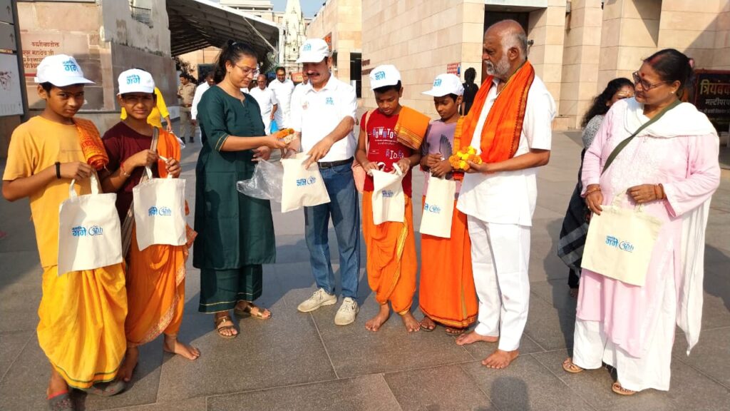 लोगों को पर्यावरण और स्वास्थ्य के लिए सिंगल यूज प्लास्टिक के खतरों के बारे में जागरूक करने के लिए गुरुवार को नमामि गंगे ने श्री काशी विश्वनाथ धाम में महर्षि योगी वेद विज्ञान विद्यापीठ के वेदपाठी बटुकों के साथ मुहिम चलाई । जन जागरूकता मुहिम के दौरान बाबा धाम में उपस्थित हजारों पर्यटकों से त्योहारों के दौरान स्वदेशी वस्तुओं को खरीदने की अपील की गई । राष्ट्रध्वज लेकर ‘स्वदेशी अपनाएं आत्मनिर्भर भारत बनाएं’ का आवाह्न किया गया । नमामि गंगे काशी क्षेत्र के संयोजक व नगर निगम के स्वच्छता ब्रांड एंबेसडर राजेश शुक्ला के नेतृत्व में नागरिकों को बाजार जाते समय कपड़े या जूट के थैले साथ ले जाने और सिंगल यूज प्लास्टिक के उपयोग का विरोध करने की सलाह दी गई । गंगा सेवक राजेश शुक्ला ने कहा कि हमें अपनी शक्ति पहचाननी होगी आत्मनिर्भरता को अपनाना होगा ।