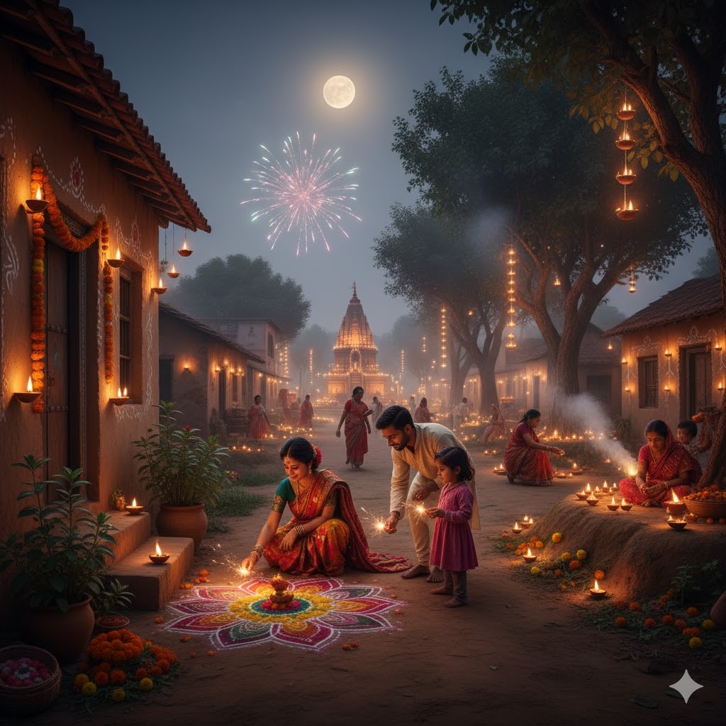 दीपावली के दिन मिट्टी वाले फर्श की गोबर से लिपाई, आंगन में रंगोली, दरवाजों पर बंदनवार और तोरण — सब मिलकर घर को पवित्रता और सौंदर्य का संगम बना देते हैं। महिलाएं नए वस्त्र धारण कर घी के दीप सजाती हैं और उन्हें मंदिरों में अर्पित करती हैं। बांस की मढ़ाई पर दीपों को सजाकर जो दीपमालाएं बनती हैं, वे सौंदर्य की ऐसी झलक पेश करती हैं जो मन को मोह लेती है। इस दिन घर-आंगन में जलाए गए दीप अंधकार और नकारात्मकता को दूर करने का प्रतीक होते हैं।