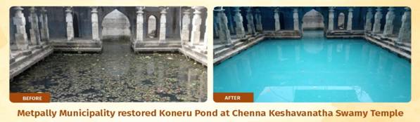 तेलंगाना राज्य के मेटपल्ली नगर पालिका ने स्वच्छता ही सेवा अभियान के दौरान एक उल्लेखनीय कार्य करते हुए चेन्ना केशवनाथ स्वामी मंदिर के प्राचीन कोनेरू (तालाब) का जीर्णोद्धार किया। यह तालाब वर्षों से प्लास्टिक, गाद और मलबे से भरा हुआ था, जिससे इसका धार्मिक और पर्यावरणीय महत्व क्षीण हो गया था।