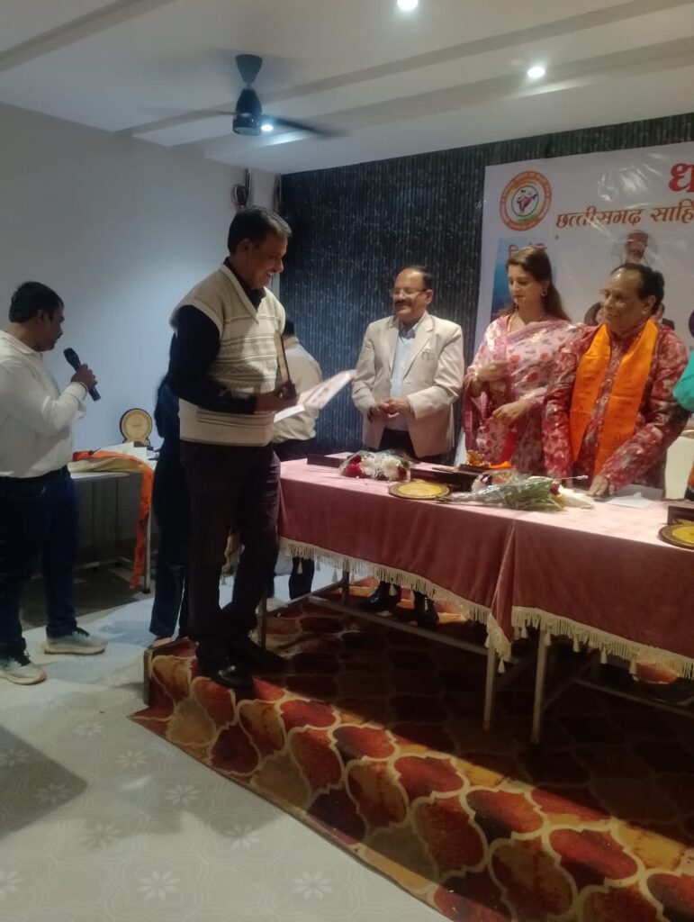 बिलासपुर। “धरा वंदन छत्तीसगढ़ साहित्य एवं संस्कृति मंच द्वारा आयोजित पुस्तक विमोचन व कवि सम्मेलन में नगर के विख्यात व वरिष्ठ साहित्यकार सुरेश सिंह बैस को “उत्कृष्ट साहित्य शौर्य सम्मान 2025” से सम्मानित किया गया है। कार्यक्रम में उपस्थित अतिथियों ने सम्मानित करते हुए इन्हें सम्मान पत्र, स्मृति चिन्ह, अंग वस्त्र व तिरंगे में लिपट जाऊं नामक साहित्य पत्रिका भेंट की गई। ज्ञात हो तिरंगे में लिपट जाऊं पुस्तक में श्री बैस के सृजन को सम्मिलित किया गया है। कार्यक्रम के मुख्य अतिथि के रूप में वरिष्ठ साहित्यकार डॉ विनय मोहन पाठक विशिष्ट अतिथि के रूप में समाज सेवी प्रवीण झा, प्रीति जैन, रमेश चंद्र श्रीवास्तव उपस्थित थे।