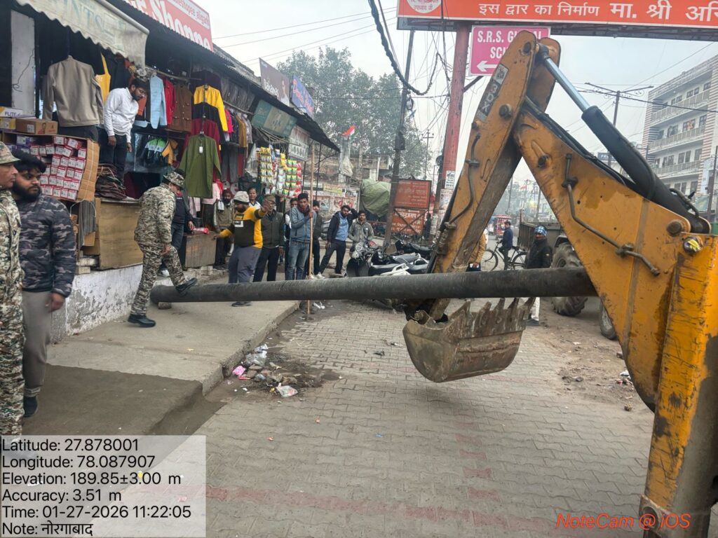 नगर आयुक्त प्रेम प्रकाश मीणा द्वारा शहर की जलनिकासी को प्रभावी बनाने व शहर को जाम मुक्त बनाने की दिशा में किये जा रहे प्रयासों के क्रम में नगर निगम प्रवर्तन दल ने नोरंगाबाद में अतिक्रमण अभियान चलाया। मंगलवार को नगर निगम द्वारा सहायक नगर आयुक्त वीर सिंह की अगुवाई में नोरंगाबाद देवी मंदिर से पेट्रोल पंप तक सड़क के दोनों तरफ अतिक्रमण हटाने की कार्रवाई की गई। अभियान के दौरान नगर निगम प्रवर्तन दल के जवानों ने सड़क एवं नाली पर किए गए अतिक्रमणों को चिन्हित करते हुए जेसीबी मशीन से हटवाया मौके पर अवैध अतिक्रमण करने वालो को चेतावनी देते हुए ₹6500 का जुर्माना भी वसूला गया।