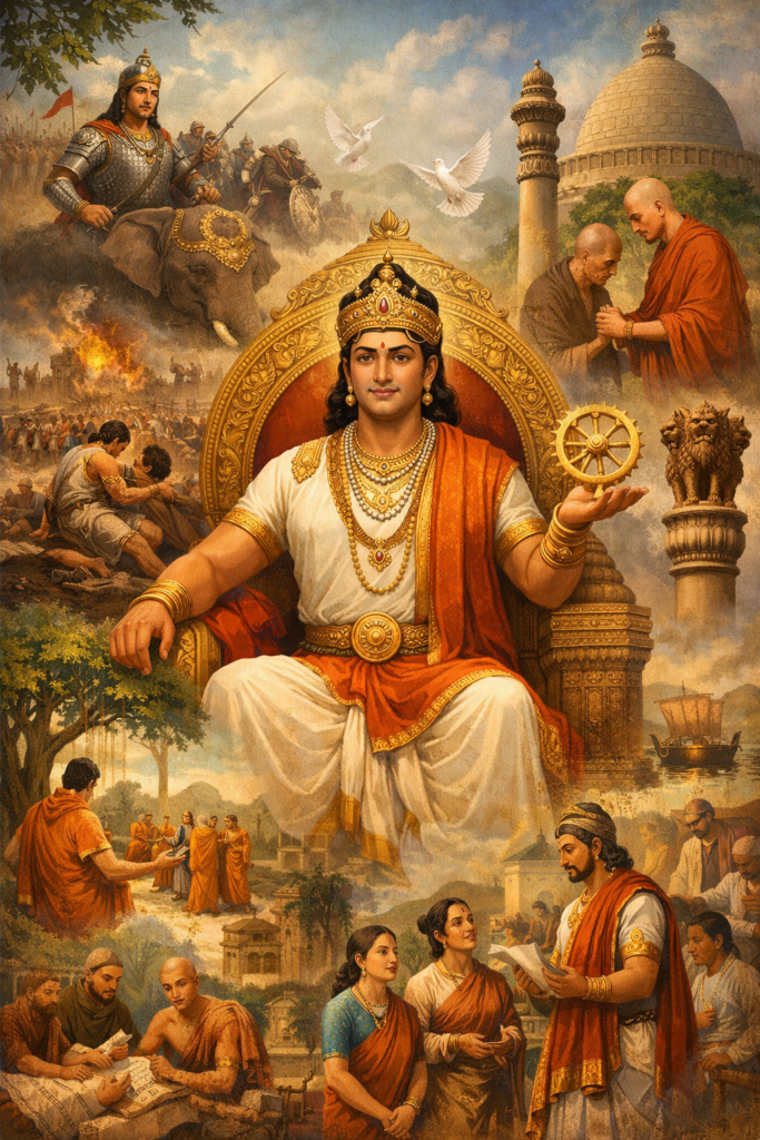 अशोक महान् बिंदुसार के पुत्र थे, यद्यपि अशोक बड़े पुत्र नहीं थे पर बिंदुसार के बाद गद्दी पर यही बैठे। अपने पिता के समय में वह उज्जैन का सूबेदार रह चुका था और तक्षशिला का विद्रोह उसी ने दबाया था। उसे शासन का काफी अनुभव था। अशोक 269 ई. पू. गद्दी पर बैठा। कुछ ग्रंथों का कहना है कि वह अपने भाईयों की हत्या करके गद्दी का अधिकारी बना। पर यह बात गलत है क्योंकि उसके कुछ भाई तो बाद में भी उसके साथ रहते थे। पर गद्दी पर बैठने के समय अशोक को कुछ संघर्षो का सामना अवश्य करना पड़ा था, क्योंकि वह 269 ई. पू. में गद्दी पर बैठा जबकि बिंदुसार की. मृत्यु 273 ई. पू. में हो चुकी थी। बीच के तीन-चार वर्ष संघर्ष के कारण ही अशोक का राज्याभिषेक नहीं हो पाया।
