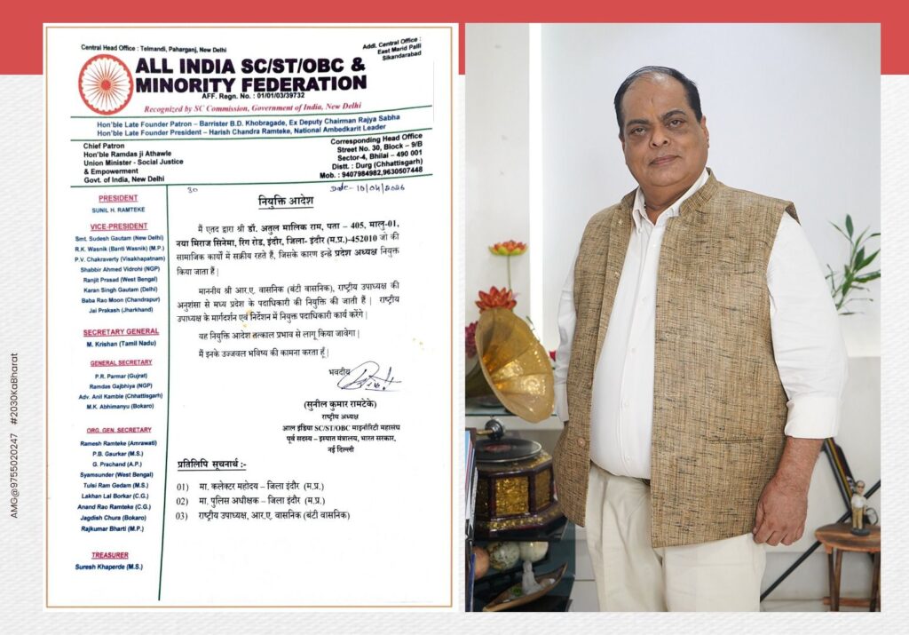 भोपाल: ऑल इंडिया एससी/एसटी/ओबीसी एंड माइनॉरिटी फेडरेशन ने संगठन की मजबूती और विस्तार की दिशा में एक बड़ा कदम उठाते हुए राजनीतिक रणनीतिकार डॉ. अतुल मलिकराम को मध्य प्रदेश का प्रदेश अध्यक्ष नियुक्त किया है। संगठन के राष्ट्रीय उपाध्यक्ष श्री आर.ए. वासनिक (बंटी वासनिक) की अनुशंसा पर जारी इस नियुक्ति आदेश में डॉ. मलिकराम के सामाजिक कार्यों के प्रति समर्पण और उनकी सक्रियता को मुख्य आधार बताया गया है। केंद्र सरकार के एससी आयोग द्वारा मान्यता प्राप्त इस संगठन का उद्देश्य वंचित और अल्पसंख्यक वर्गों के अधिकारों की रक्षा करना है। डॉ. अतुल मलिकराम की इस नियुक्ति से उम्मीद जताई जा रही है कि प्रदेश में सामाजिक सशक्तिकरण के अभियानों को नई ऊर्जा और रणनीतिक दिशा मिलेगी।