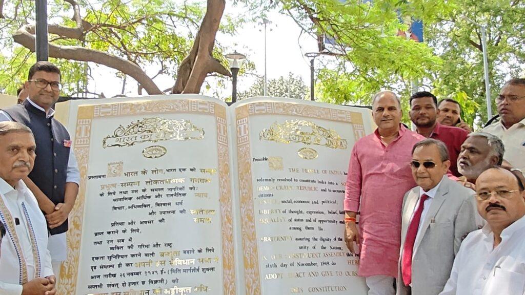 सोमवार को लगभग 1.5 करोड़ की लागत से शहर में विकसित हुए डॉ भीमराव अंबेडकर संविधान पार्क का महापौर प्रशान्त सिंघल, कोल विधायक अनिल पाराशर अपर नगर आयुक्त राकेश कुमार यादव सेवानिवत्त न्यायधीश शंकर लाल डॉ बाल किशन राजेंद्र छावनी महिला बिंग अध्यक्ष राजकुमारी मंजू भूषण, राकेश सहाय ने पार्क का उद्घाटन, भगवान महात्मा बुद्ध जी की प्रतिमा व संविधान क़िताब का अनावरण किया।
