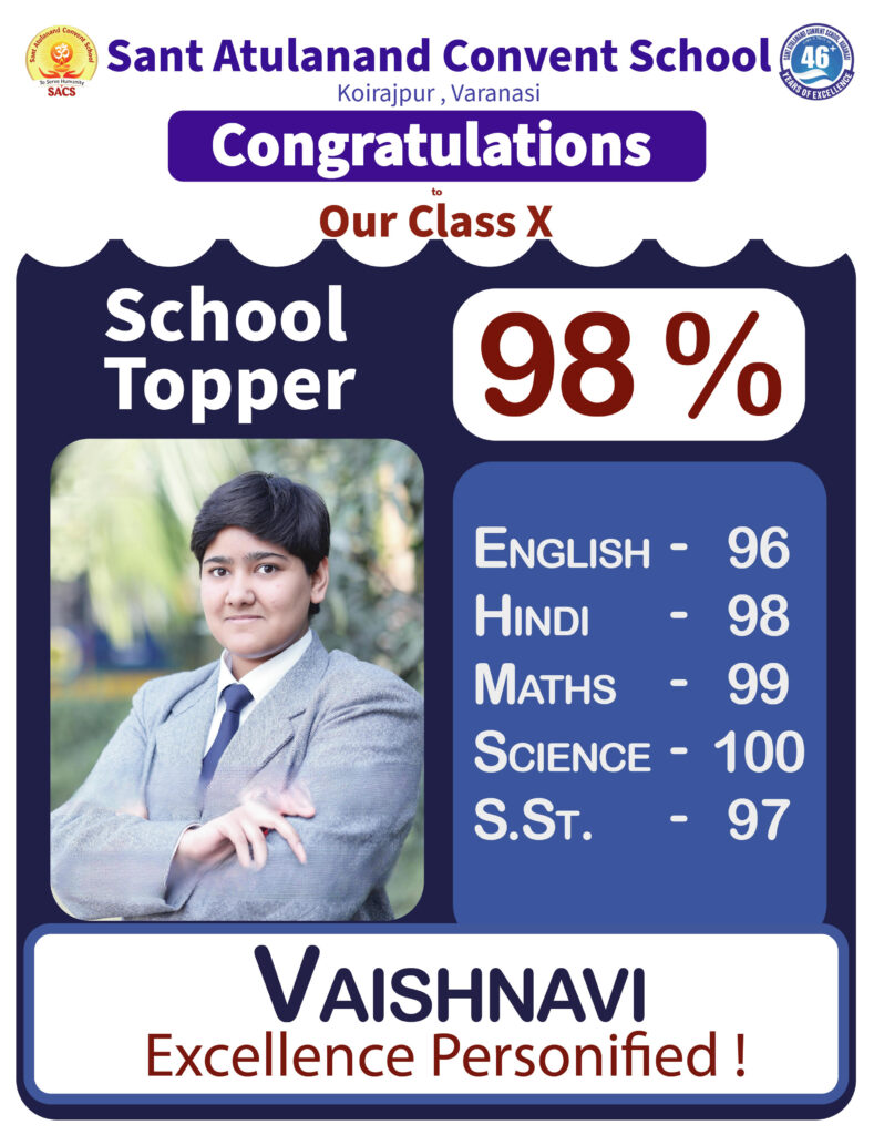 वाराणसी: केंद्रीय माध्यमिक शिक्षा बोर्ड (सीबीएसई) द्वारा घोषित कक्षा 10वीं के परीक्षा परिणामों में संत अतुलानंद कॉन्वेंट स्कूल, कोइरजापुर के विद्यार्थियों ने एक बार फिर उत्कृष्ट प्रदर्शन करते हुए विद्यालय का नाम गौरवान्वित किया है। इस वर्ष विद्यालय का परीक्षा परिणाम लगभग शत-प्रतिशत रहा, जो विद्यार्थियों की मेहनत, शिक्षकों के मार्गदर्शन तथा अभिभावकों के सहयोग का प्रत्यक्ष प्रमाण है।