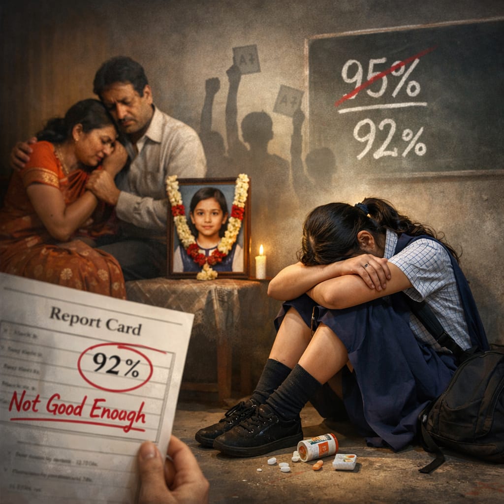 95% की चाह और 92% का परिणाम। यह अंतर केवल तीन अंकों का है, परंतु इसी तीन अंकों ने एक जिंदगी की पूरी संभावनाओं को निगल लिया। प्रश्न यह नहीं कि उस बच्ची ने ऐसा कदम क्यों उठाया; असली प्रश्न यह है कि हम उसे उस मानसिक स्थिति तक पहुंचने से रोक क्यों नहीं पाए?