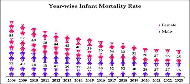 शिशु मृत्यु दर में भी उल्लेखनीय गिरावट दर्ज की गई है। 2008 से 2023 के बीच लड़कों और लड़कियों दोनों के लिए मृत्यु दर में निरंतर कमी आई है, जो स्वास्थ्य सेवाओं की बेहतर उपलब्धता और जागरूकता में वृद्धि का परिणाम है।